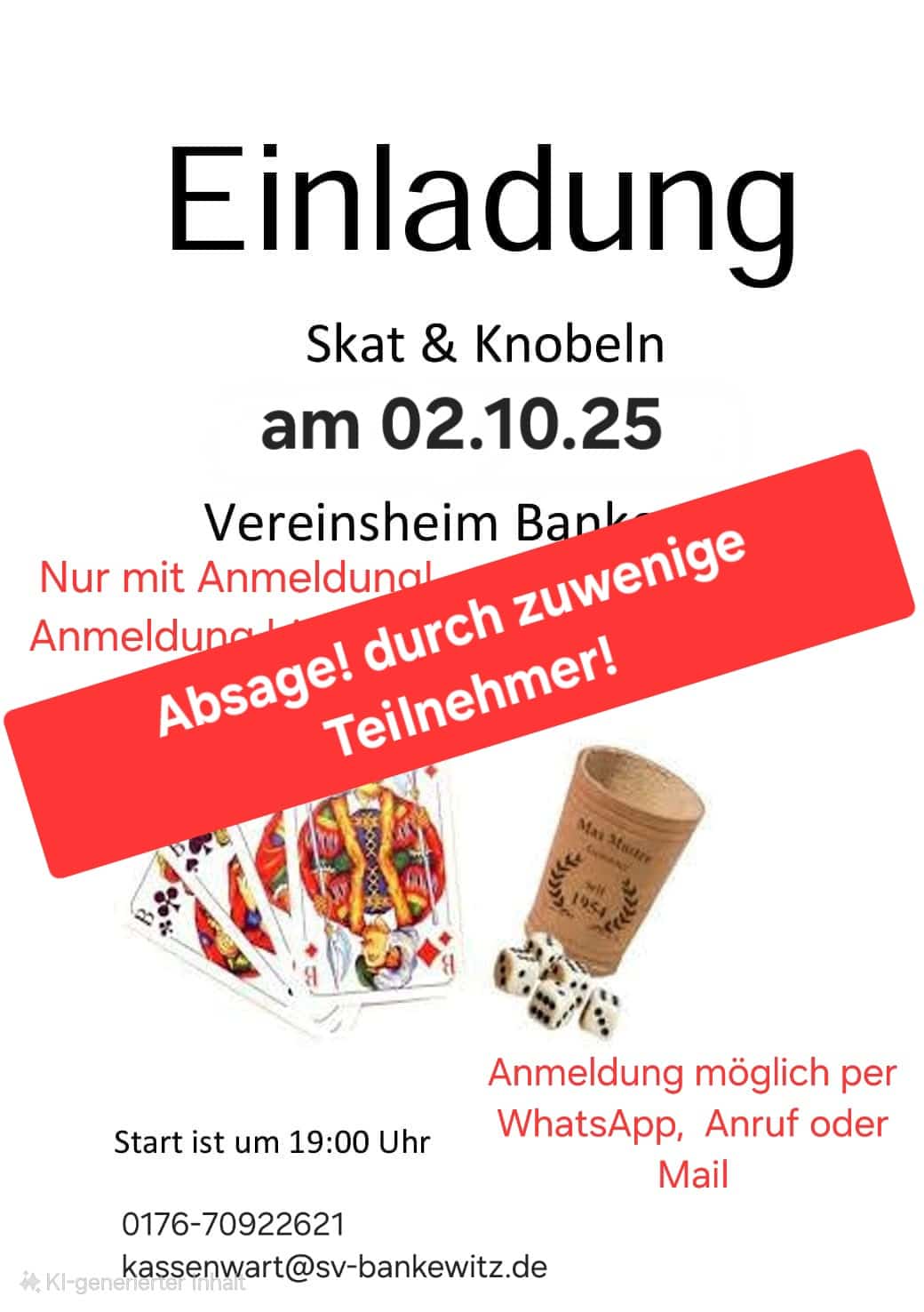 Aufgrund der unsicheren und kurzfristigen Entscheidung der Regierung zu den Coronemaßnahmen müssen wir den Skat- und Knobelabend absagen.